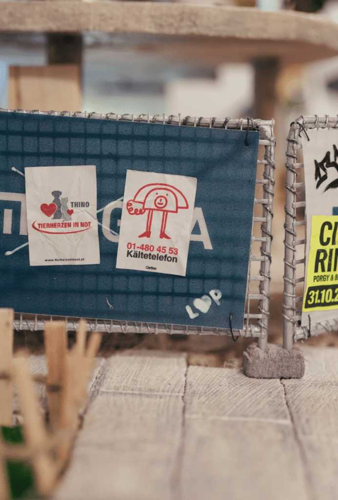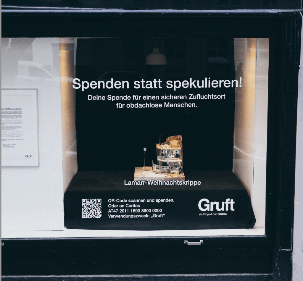 Ein QR-Code im Schaufenster führt direkt zur Gruft der Caritas der Erzdiözese Wien, einer der wichtigsten Einrichtungen für obdachlose Menschen in Österreich. Die Gruft bietet Schutz,